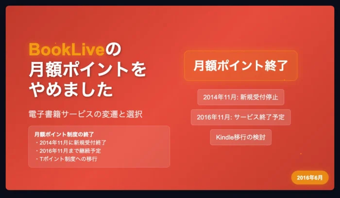 BookLiveは2014年の11月に、BookLiveの月額ポイント制度をやめました。その時すでに加入している人たちに対しては、一年間は続ける、としていたものの、新規加入については打ち切った形です。その代わりに、これからはTポイントを推していくよ、というようなメッセージがありましたが、まぁ、普通にBookLiveの月額ポイント購入のほうがお得で... -