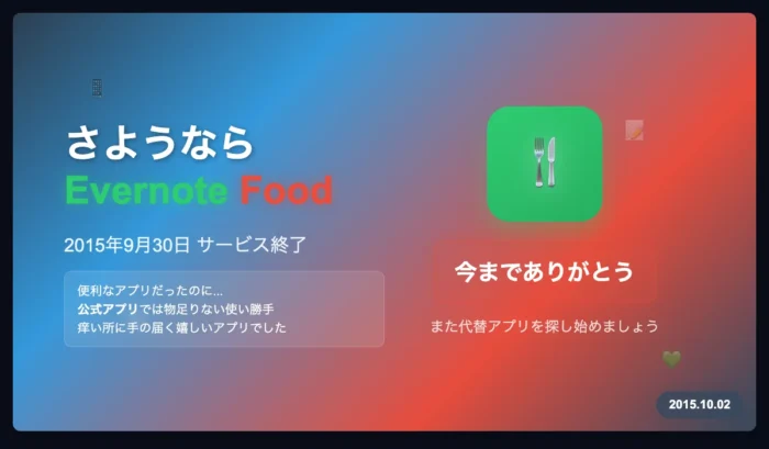 Evernote Food、終了 9月30日に終了されると告知されていたEvernote Foodですが、予定通りサポート終了となりました。便利なアプリだったのですが…。Evernoteの公式によると、Evernoteの公式アプリでも問題ない、という判断のようです…が、ここ一ヶ月、公式アプリを使った感触からいくと、果たして、どうかな…というのが、正直な感想です。ま...