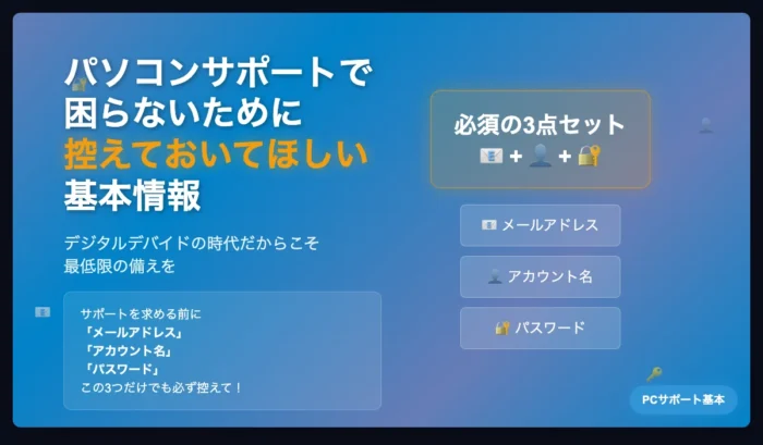 パソコンのサポートを求める初心者の人には「メールアドレス」と「アカウント名」と「パスワード」だけでも控えてほしい