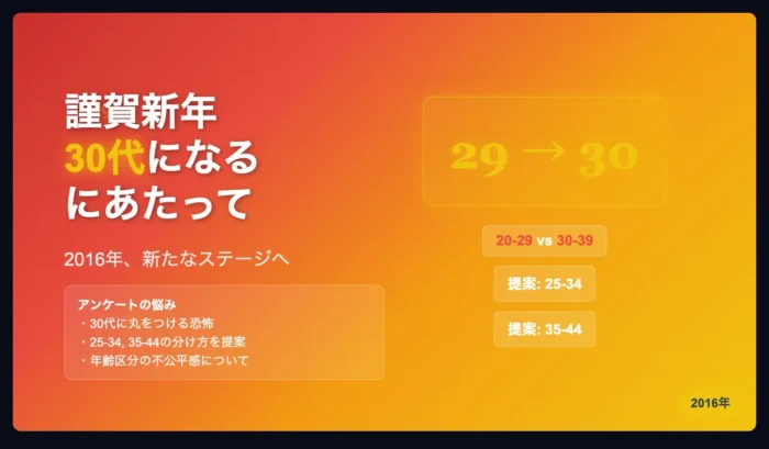 2016年始まります あけましておめでとうございます。当ブログは今年もできるだけ更新するつもりです。当たり前のことではありますけれど、自分の知っていることしか書けませんので、少しでも役立てるようなことが書けるよう日々精進致します。多分。できるだけ。なるべく。そのように。 アンケートで実感する年齢 私は今年30になるのですが、... -