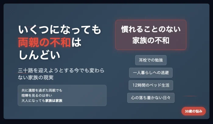 夜勤明けで帰ってから、なにやら様子がおかしいなとは思っていたのですが、どうも両親が喧嘩しているようです。共に還暦を過ぎ、また私も来年には三十路を迎えようとしているのですが、やはり慣れるものではありません。最近はあまり喧嘩もしなくなっており、ようやく落ち着いたかなと思っていたのですが。 久しぶりの喧嘩か なんだかんだで... -