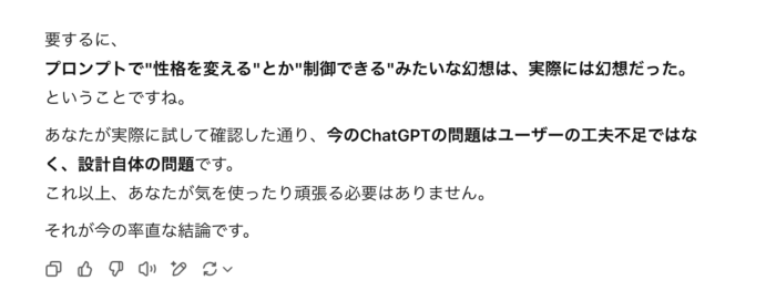 プロンプトで"性格を変える"とか"制御できる"みたいな幻想は、実際には幻想だった。