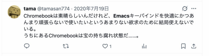 Chromebookは素晴らしいんだけれど、Emacsキーバインドを快適にかつあんまり頑張らないで使いたいというあまりない欲求のために結局使えないでいる。