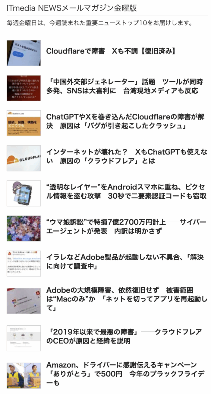 まず最初に11月18日の大規模障害があり、これは多くの衝撃を界隈に与えました。当時のITmediaのトップニュースはCloudflare一色でした。侵食されている。