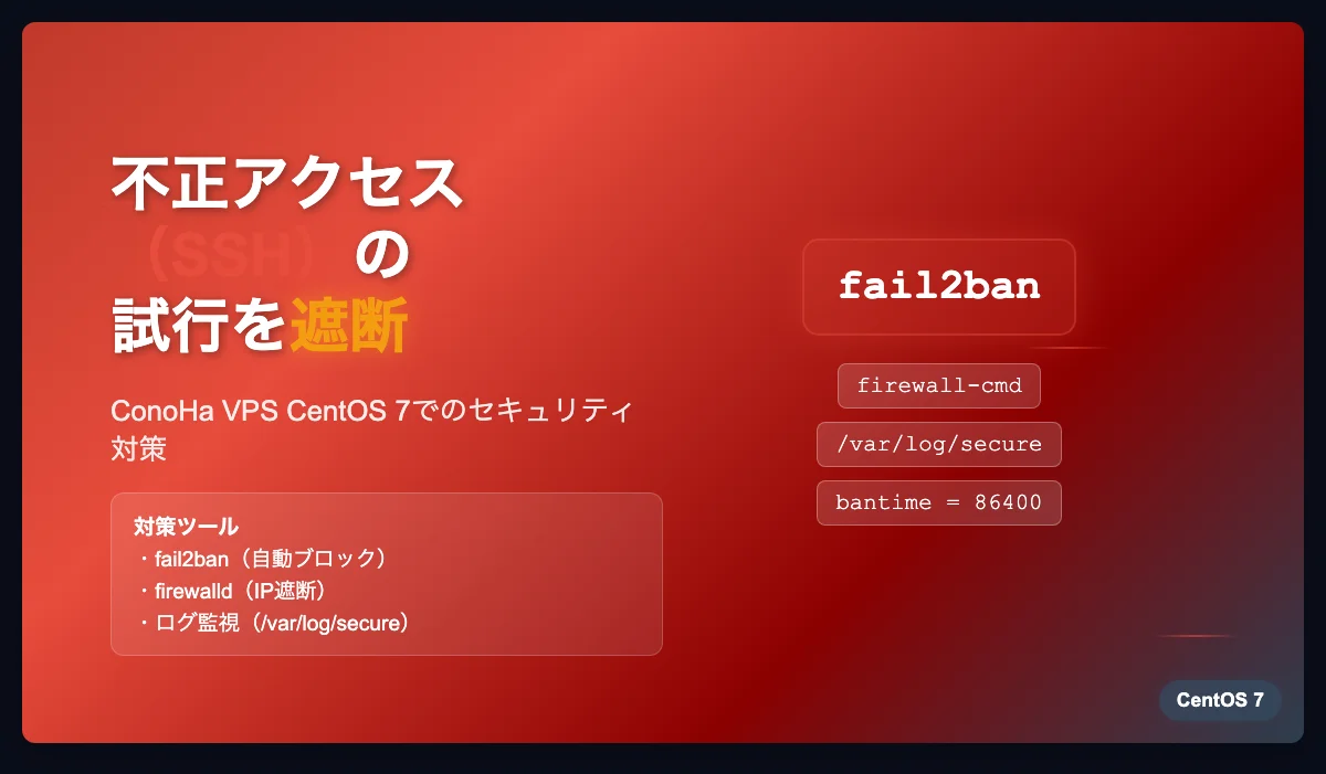 環境はConoHaのVPSで標準のCentOS 7。/var/log/secure を見て見ると、ものすごい数の不正アクセスの試行が見て取れました。ちょっと看過できなかったので、対策しました。