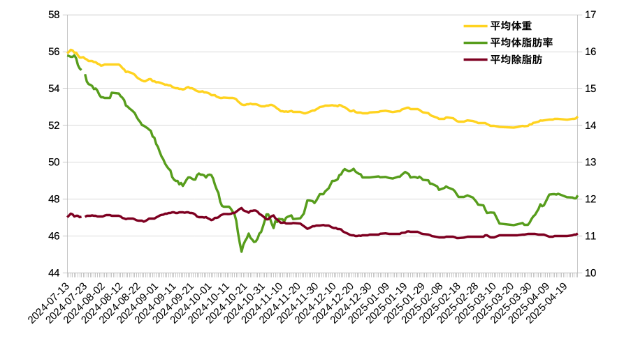 しかしこれ以上同じ事をできないのではないか、と思われたのが、当初の56kgから平均51kg台に突入した段階で、これ以上落としたくないなぁという気持ちが生じた。それで、少し体重については増えてもいいか、という気になった。で、結果、増えた。