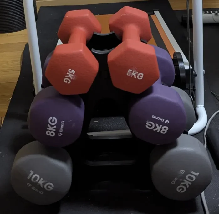 ちなみに5kg,8kg,10kgセットのやつは18000円くらいしてビビるが、バラバラで買っても割とそれくらいになるのでけっこう相場だったりする。