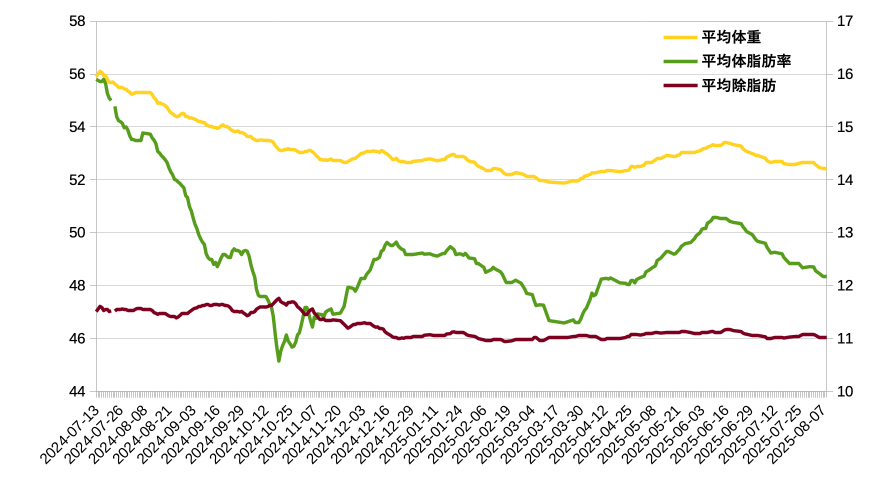14回分移動平均(割とサボって毎日計測してないことがあるので)。