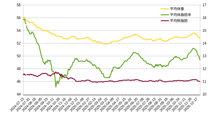 52kgまで落としたところで、これ以上体重を落としても貧相になるだけだと思い、その後は増やしたり減らしたりしている。一応年末にかけて52kg付近に落とした形になっている、と思う。