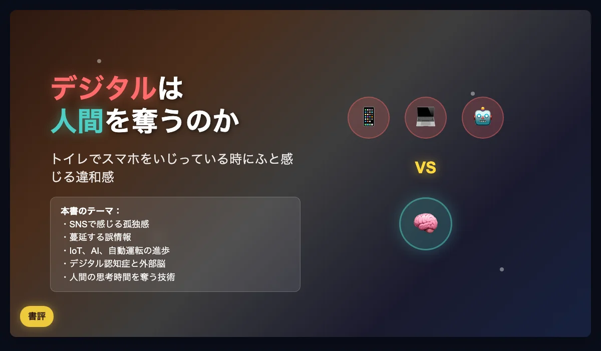 全体的に、デジタルで便利になったはずだし、実際便利になっていると思うんだけれど、いつまでも忙しいし、別に賢くなった気もしないなぁとか、トイレでスマホをいじっている時とかにふと感じる違和感のあれこれを、色々なトピックを取り上げつつ語る、みたいな感じです。これだけまとまると、本として成り立つのですね。