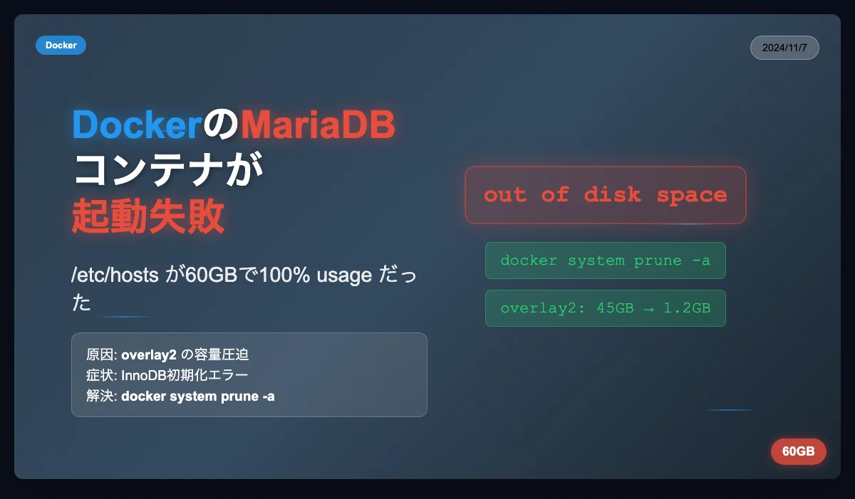 表題のとおりなのだが、MariaDBコンテナが突然起動に失敗するようになり、永遠に再起動をしていた。で、ログを見るとどうも容量不足っぽかった。……え?