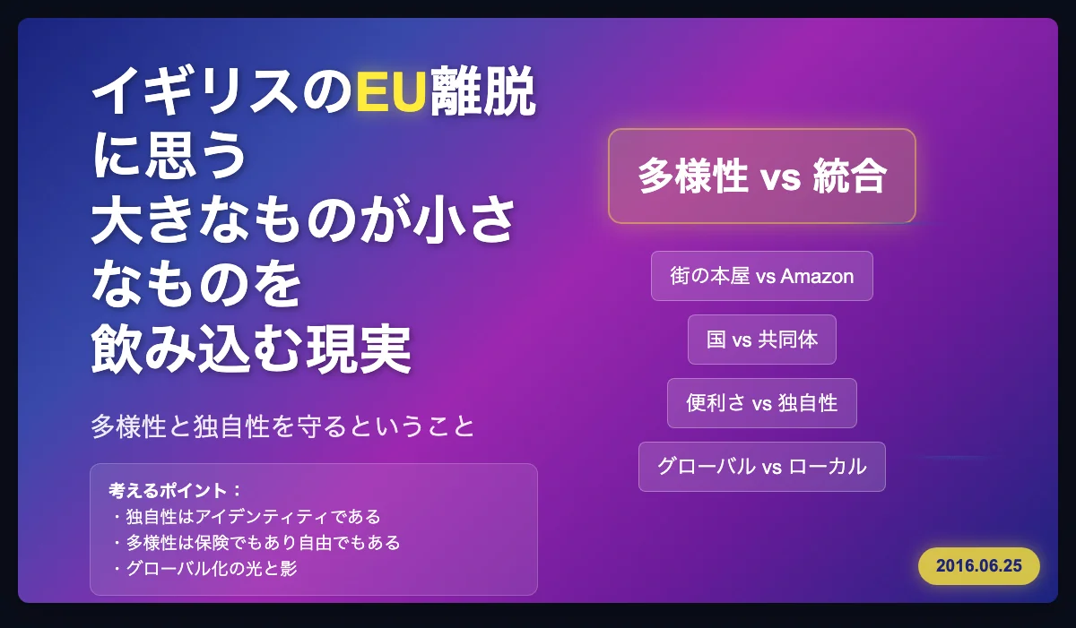 平生はあまり政治的な話をしないのですが、今回のイギリスのEU離脱は非常に大きな出来事ですので、私も注目していました。個人的には、9.11クラスの衝撃です。本当に離脱が決まるとは。