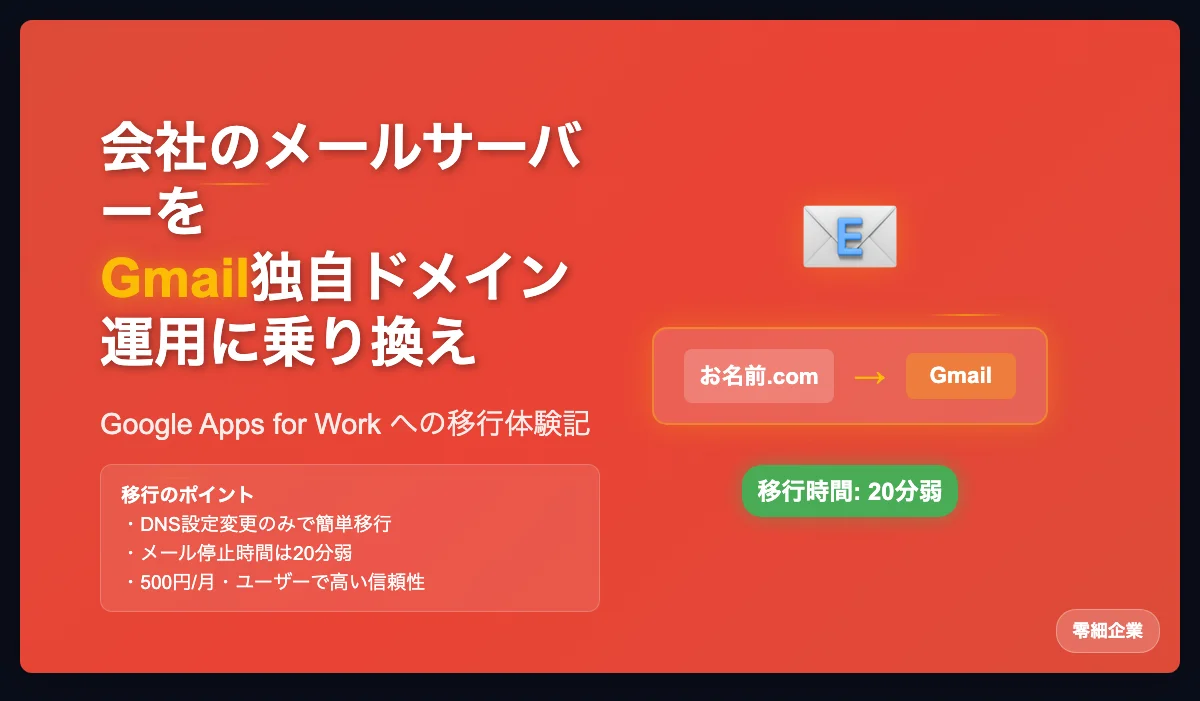 私の勤め先は社員数人の零細企業です。最近メールサーバーをお名前.comのレンタルサーバーからGmailに乗り換えました。メールサーバーを止めた(というよりDNS設定後にGmailの設定が完了するまでの)時間は20分弱でした。会社のアドレスでGmailが使えるというのは、良いものですね。Googleの各種サービスも利用できますし。