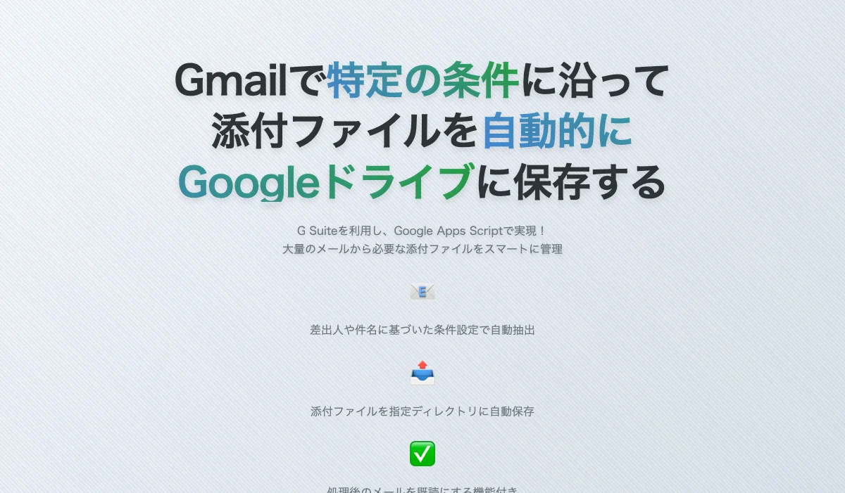 冒頭に書いたとおり。Gmailで受け取ったウンザリするほどのメール群から、差出人や件名、未読などいろいろな条件をつけて、条件にマッチしたものの添付ファイルを自動的にGoogle ドライブに保存する。