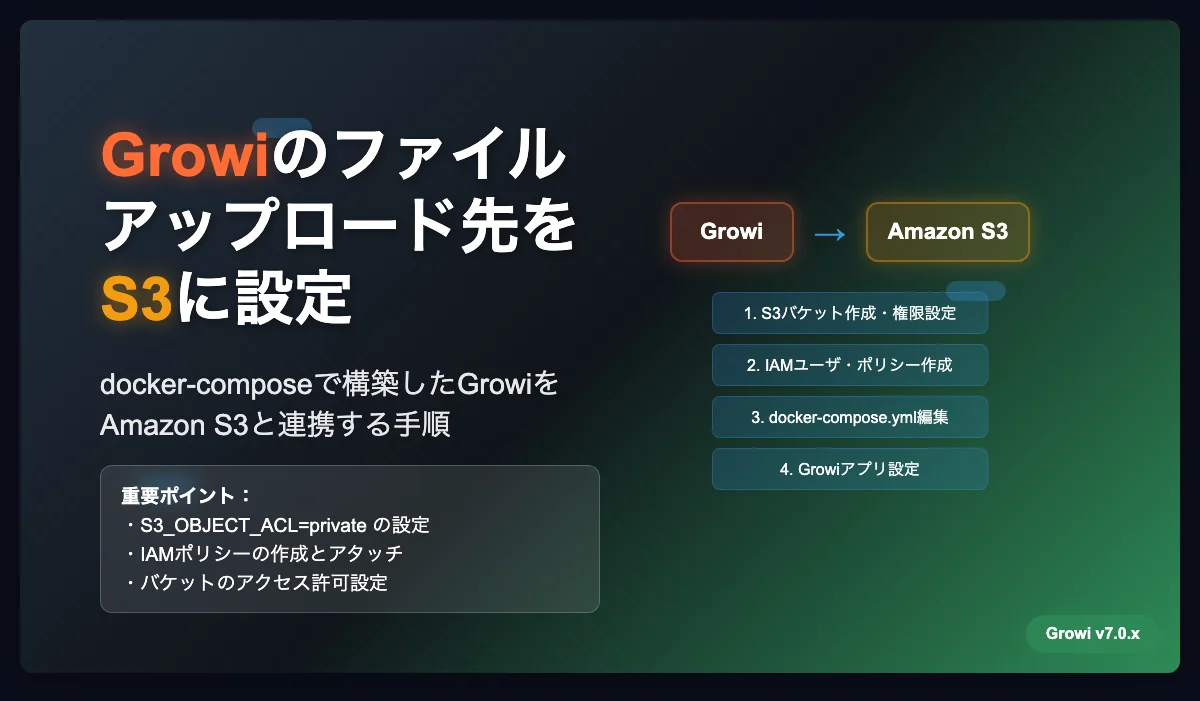Growiを通じてS3上のファイルをやりとりできるようにするための、Growi-S3間の権限設定をそれぞれすることになる。