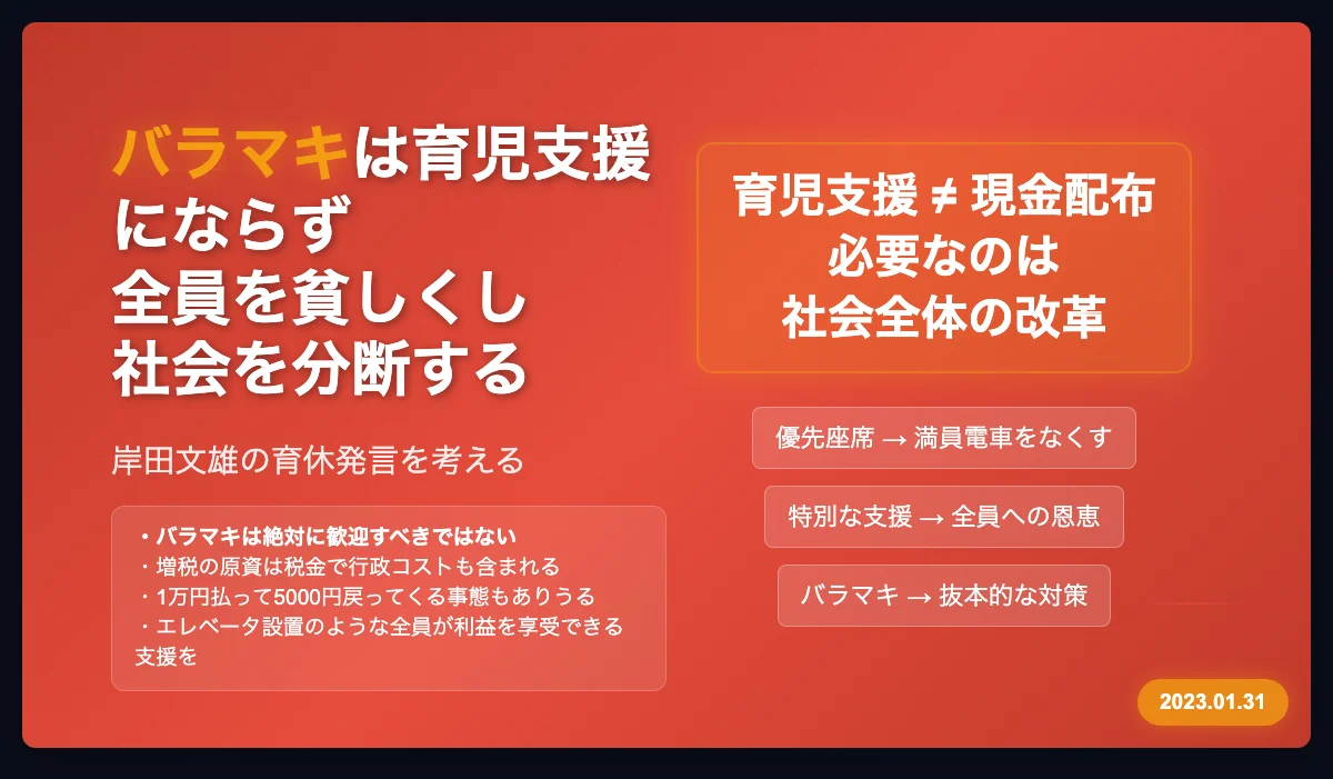 なので育休云々については議論の外としたが、育児を批判してはいけない風潮も危険ではという言説があり、それは確かにそうだなと思った。というのも、風を読む力に長けた政治家が、既にバラマキの言い訳として現実に採用し始めているからだ。それは結局増税となって国民の負担となる。そして名目とされた育児の支援にもならない。