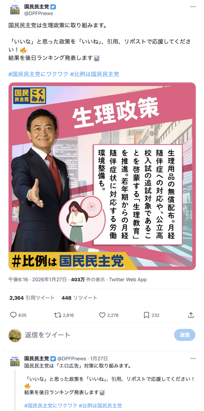 国会でエロエロ絶叫していたのは記憶に新しいですけれど、国民民主党のエロ広告に対する異常な執着はなんなんでしょう。やはりエロは党是なんでしょうか。