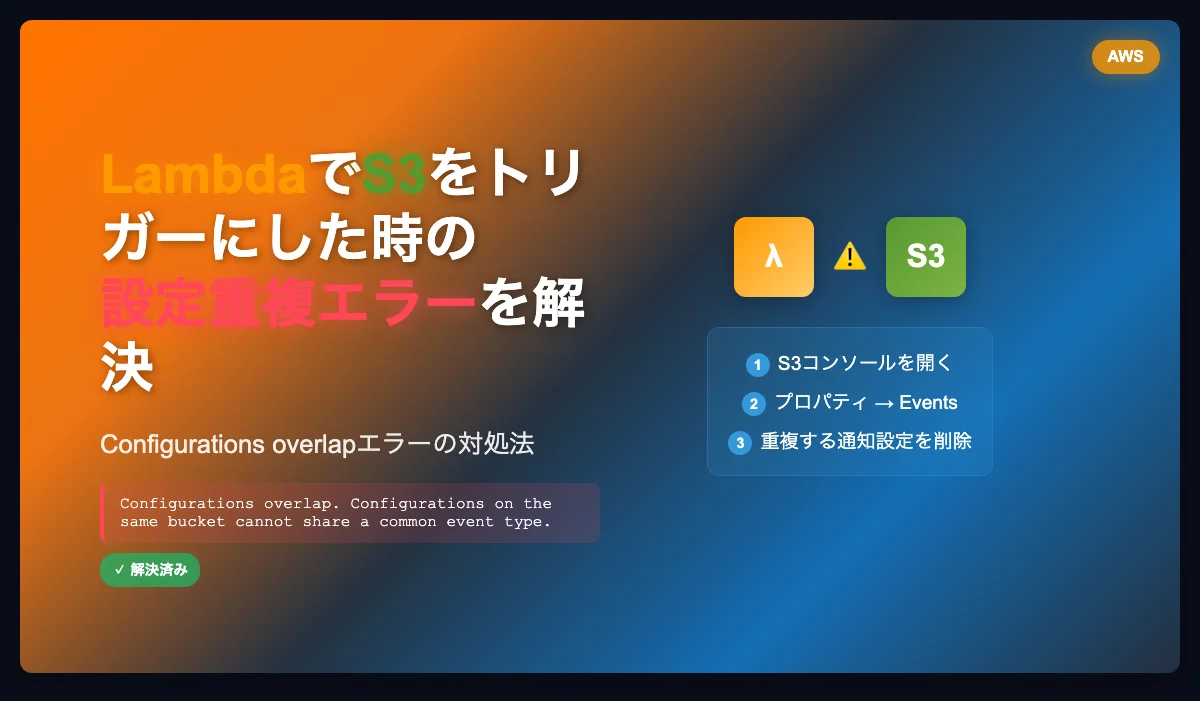 LambdaでS3をトリガーにして保存しようとすると、「Configurations overlap. Configurations on the same bucket cannot share a common event type.」とか言って怒られる。