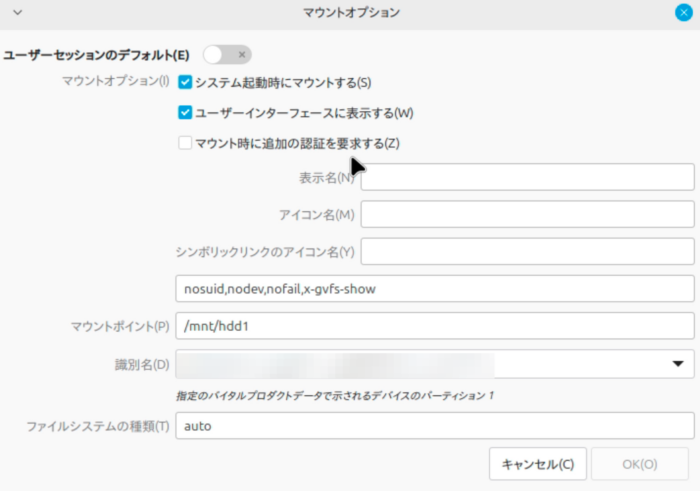 - 「システム起動時にマウントする」にチェックを入れる