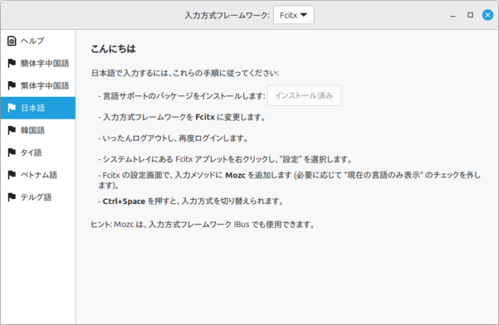 画面の指示通りにやるだけ。最終的にFcitx + Mozcになる。