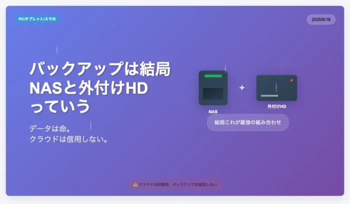 バックアップは結局NASと外付けHDっていう