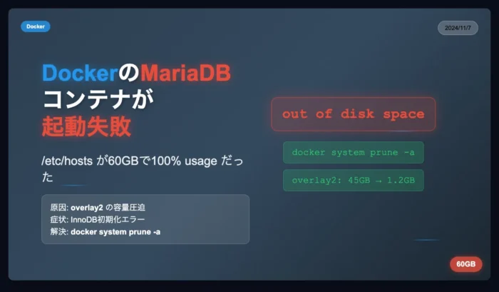 DockerのMariaDBコンテナが起動失敗すると思ったら /etc/hosts が60GBで100% usage だった