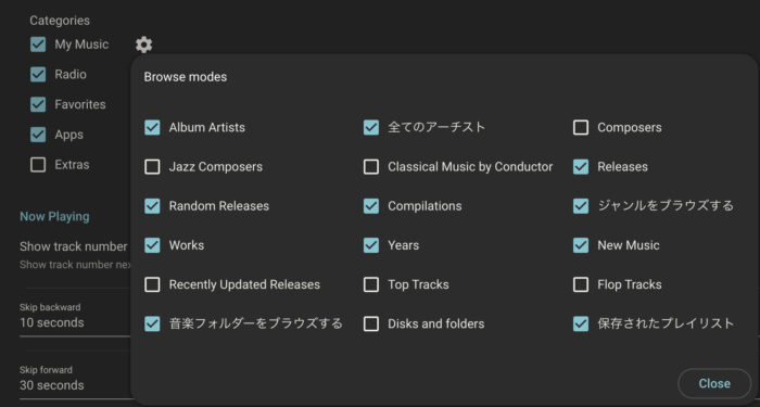 僕はライブラリ管理せずにフォルダベースでやっているので、LMSではInterfaceの設定から以下のように「Categories」の歯車より「音楽フォルダーをブラウズする」にチェックを入れる。