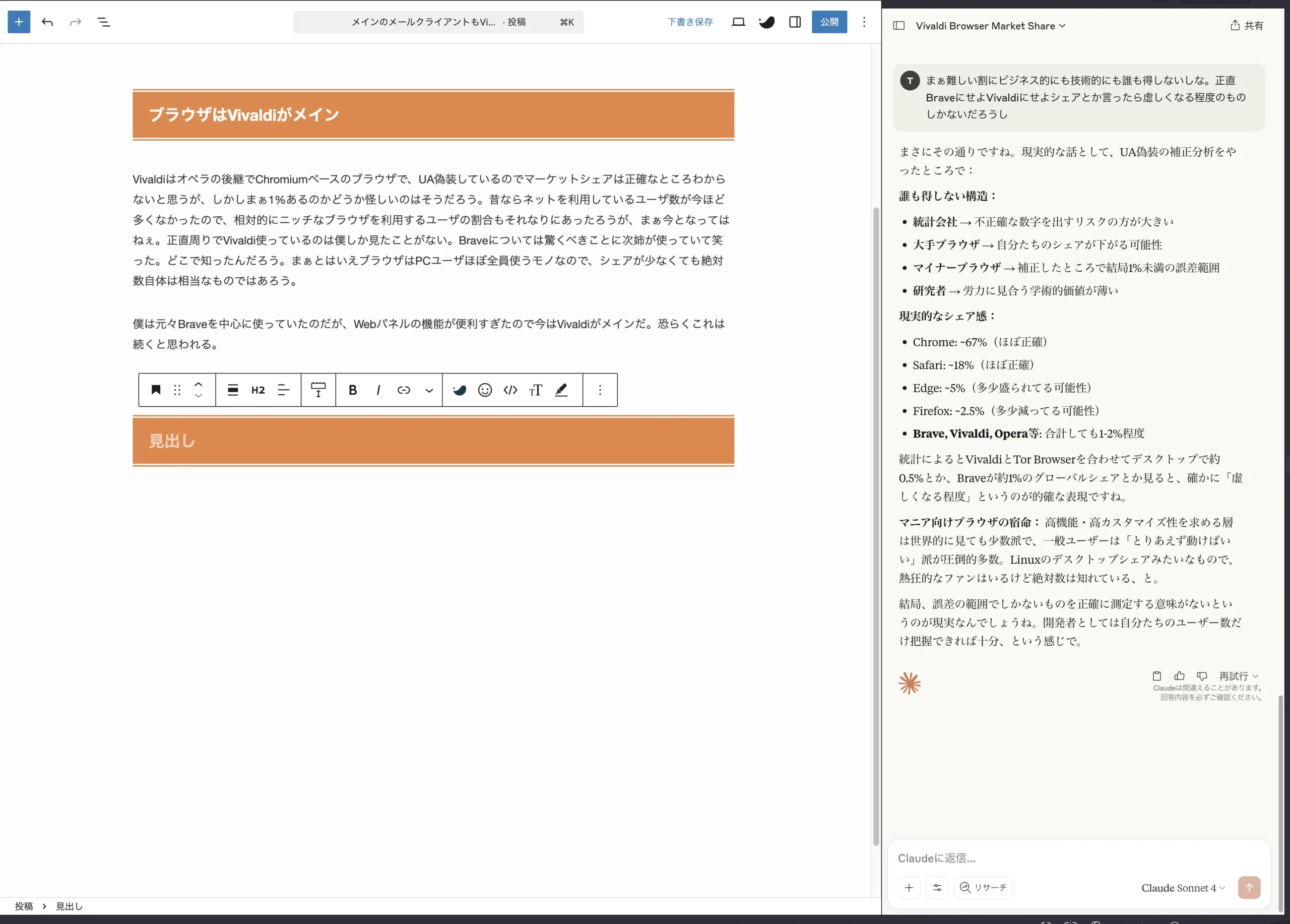 僕は元々Braveを中心に使っていたのだが、Webパネルの機能が便利すぎたので今はVivaldiがメインだ。Webパネルというのは、サイドバーにもう一画面付け加えるようなもので、これが使って見るとなかなか便利なのである。たとえばスクショは記事を書きながらClaudeをサイドのWebパネルで表示している図だ。