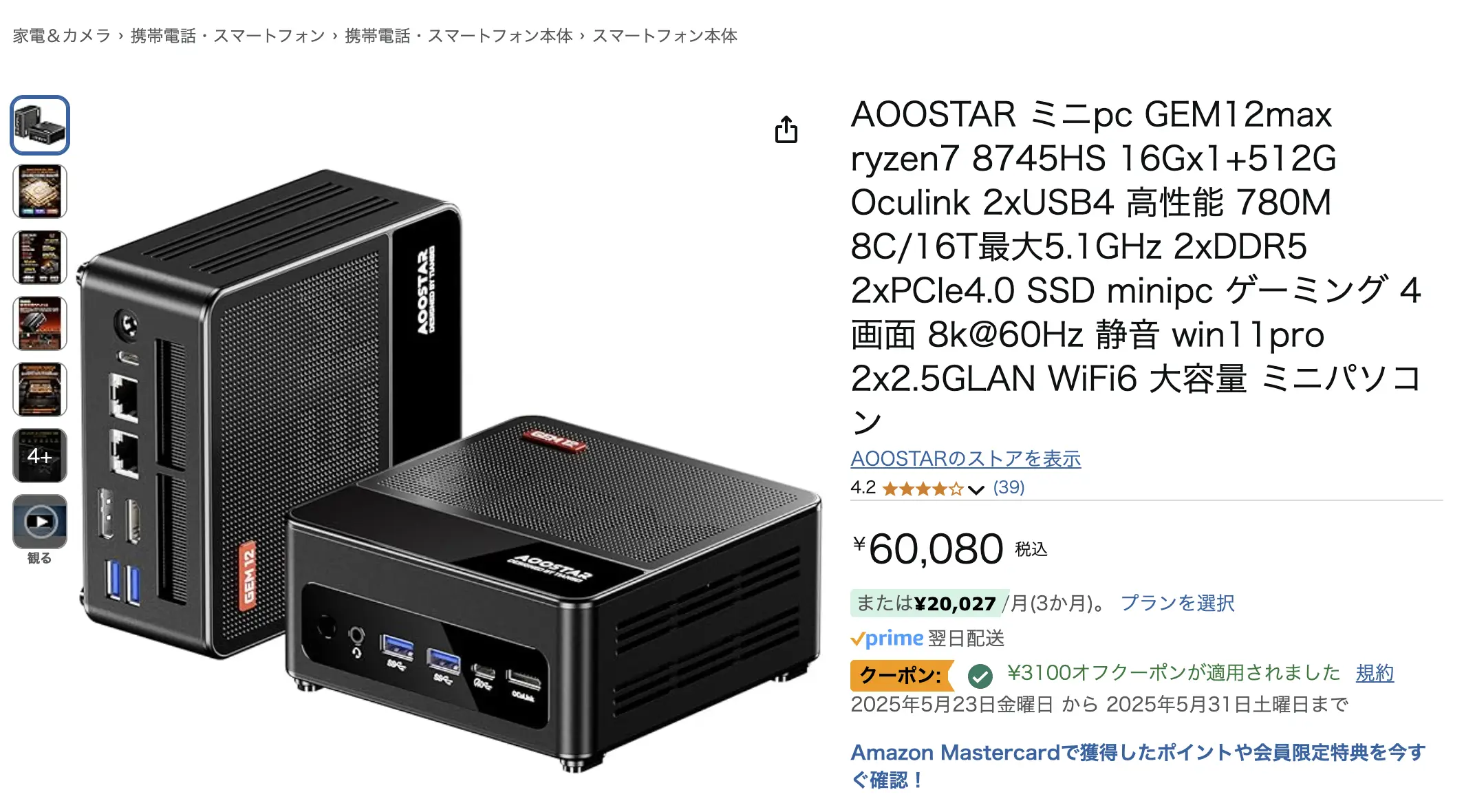 まぁ具体的にはAOOSTARのGEM12max とかいうやつなんだが、これがクーポン込みで57,000円ほどなんだよね。16GB RAM, 512GB SSD。ポイントはOculinkがついているところと、128GB RAMまでサポートしていることだろうか。