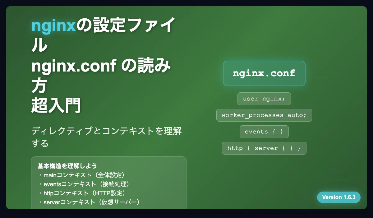 このサイトはapacheではなくnginxで稼働しています。といっても、主には勉強のためです。本記事は、私のように最近nginxを触り始めた人に向けて、「最初の状態のnginx.confにある各項目の意味がなんとなくわかるようになること」を目的とした記事です。何はともあれ、まずはここからだと思うのです。