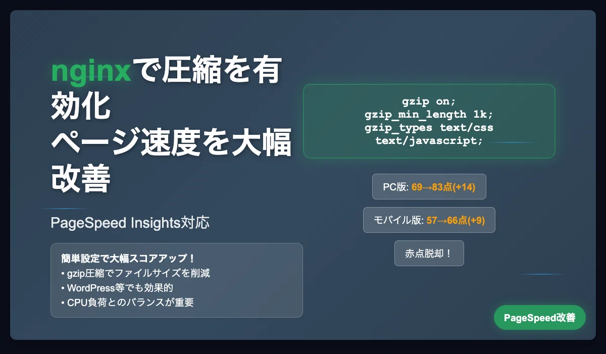 WordPressは大きなソフトウェアなので、自分でさっといじれるところが少なく、Googleからの有難い助言も、すぐ実行できるものばかりではありません。その中でこの圧縮は、nginxの設定だけで済み、かつ大幅なスコア改善が期待できる項目です。是非ともやっておきたいですね。