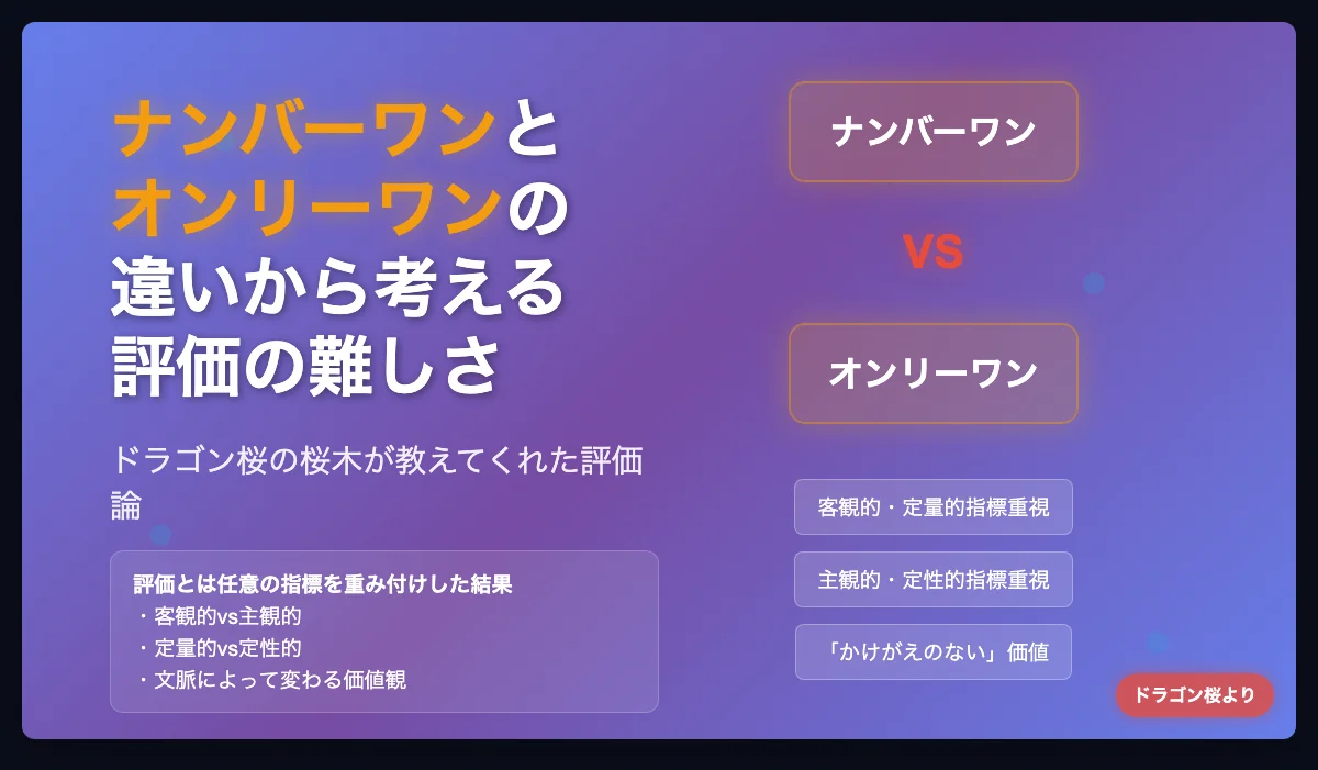 ナンバーワンとオンリーワンの違いは、用いられる指標とその重み付けのなされ方の違いと言えるだろう。ナンバーワンを決めるとなれば、客観的・定量的な指標が重視されるし、オンリーワンであれば主観的・定性的な指標が重視される。用いられる指標は重複するものもあるし、どちらかにしかないものもある。指標の用いられ方は人によって異なるが、それが主観的・定性的な指標であるほど、評価のブレが大きい。