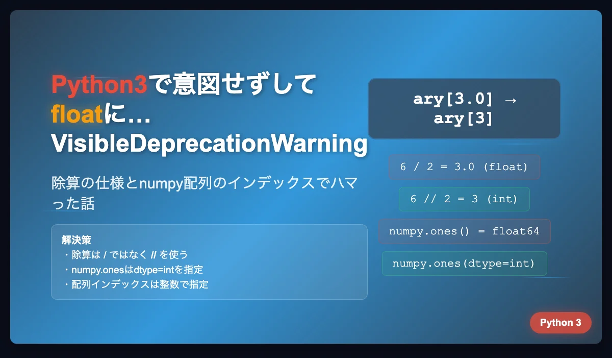 Pythonで、以前から「VisibleDeprecationWarning: using a non-integer number instead of an integer will result in an error in the future」という警告が出て、なんだろうなと思っていたのですが、どうやら意図せずして要素数がfloatに、つまりary[3]となるべきところがary[3.0]のような状況になっていました。python3では6/2=3.0なんですね。