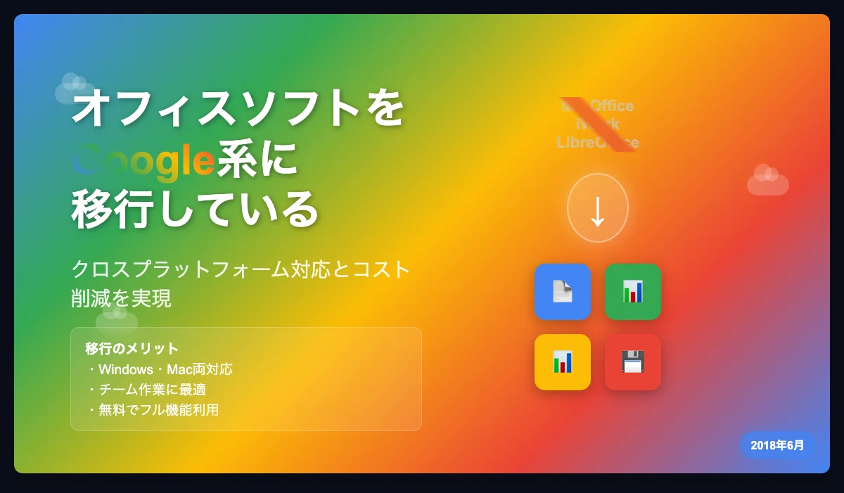 記事冒頭に書いたとおりの流れなのだが、WindowsでもMacでも使えるオフィス環境として、現在Google系をメインにできるように移行作業をしている。iWorkはWindowsでは使えず、LibreOfficeはどういうわけかMacでは重く(High Sierraにしてからの気がする)、MS Officeは高い。自分は元々オフィスソフトが好きではなく、これのために大金を払おうと中々思えない。