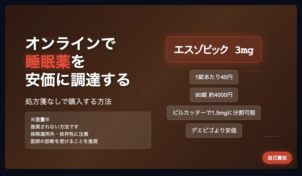 まず断っておくと、この方法は医師の診断を通さずに睡眠薬を調達する方法だが、推奨していない。当然ながら保険も適用されない(それでも安い)。医師の診断付きで、メンタルクリニックなどに行かずに睡眠薬を手に入れたいなら、オンライン診療を受診する方法があり、それについては以前記事にしたので参考にされたい。