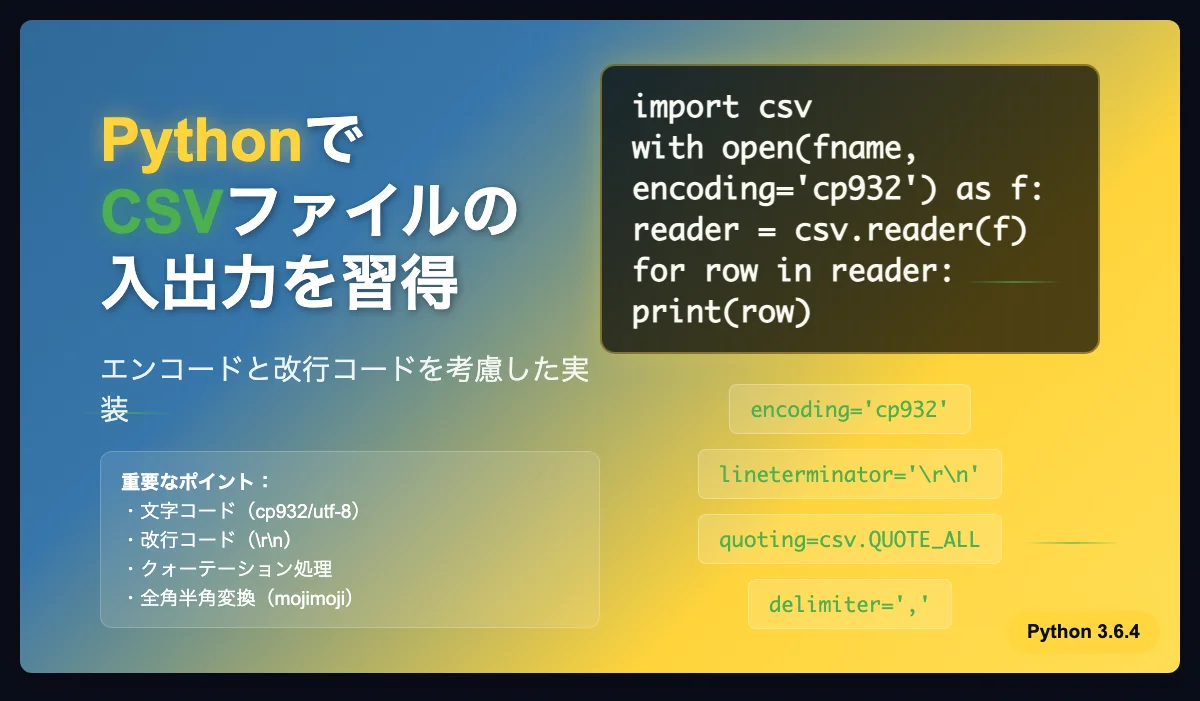 pythonにおけるcsvファイルの入出力について。csvは単なるテキストファイルであるけれど、文字コードやら改行コードやらクォーテーションの付け方やらを考えると、色々面倒臭い。