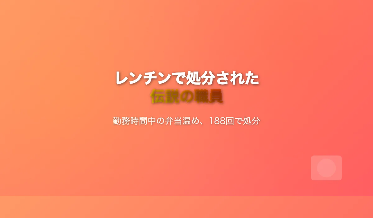 どうもこちらが本筋のように思えます。こういうことは一事が万事ですから、勤務態度も推して知るべしといったところでしょうか。それにしてもレンチンで処分は軽く伝説ですね。こんなショボい処分理由なかなかないですよ。同僚も恐らく相当苦労していたのではないかな。どうやって188回という具体的な数を数えられたのかと思えば、同僚の執念に他ならないでしょう。よほど腹に据えかねていたのか。さぞかし迷惑かけていたんでしょうねぇ……。