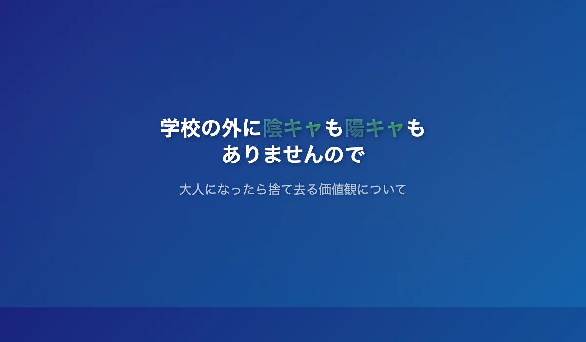 最初の違和感として、そもそもいい大人が陰キャだ陽キャだということ自体、なにか小っ恥ずかしさを感じる。ああいうキャラ付けは閉鎖的でやることのないキッズたちによる学校的価値観の産物だから、働き始めたらなるべく早く捨て去ったほうがいい。具体的には、自分や誰かを陰キャとか陽キャで雑に括らない。