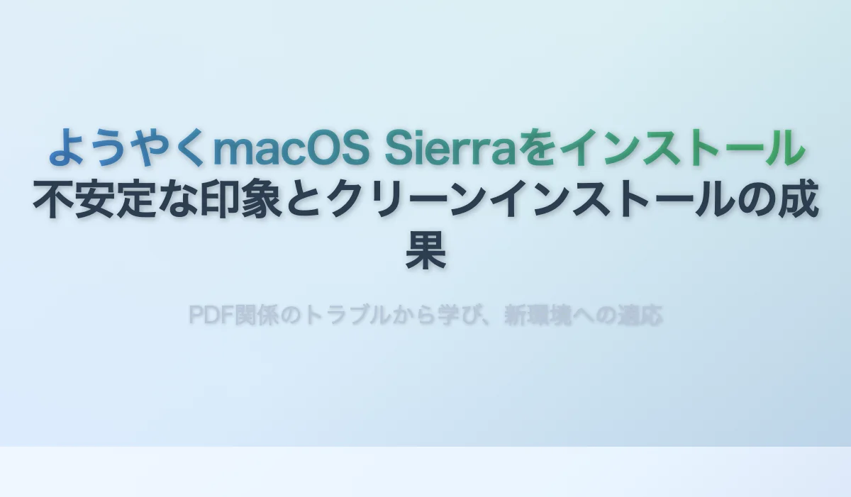macOS Sierraがリリースされて半年以上経過しました。ここ最近の中でも特に不安定な印象で、特にPDF関係のトラブルが個人的にはかなり痛かったので、アップデートを避けていましたが、さすがにそろそろ落ち着いてきたかなぁと思い、まずノートのMacBook Airにクリーンインストールさせてみました。ぼちぼち使っています。