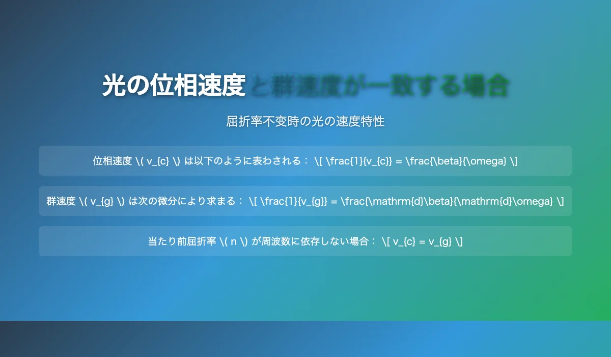 したがって、屈折率nが周波数に依存しない定数のとき、\(v_{c} = v_{g}\)。