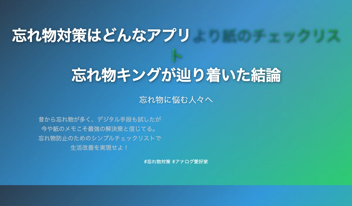 私は忘れ物が多いです。小学生の頃、通知表では忘れ物をしない的な項目に「もうすこし」をつけられていました。三つ子の魂なんとやらで、大人になってもその悪癖はなおらずにいるのですが、さすがに働いている身の上で「忘れ物が多くて」は通用しませんから、なんとかしなくてはなりません。それで、好きなコンピュータを使ってスマートに解決してやろうとアレコレした挙句、結局紙のメモに落ち着きました。紙最強。